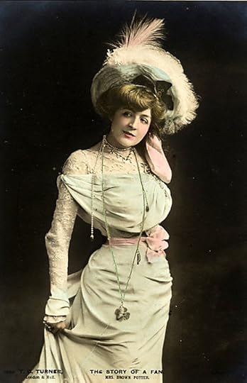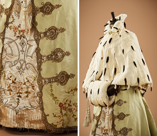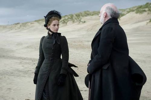 The Invisible Woman - Felicity Jones as Nelly Ternan wearing a black coat with side buttoning, standing collar and and bustle on the back, worn over a black dress. The accessories include black gloves and a feathered hat with lace-trimmed ribbon tie.
