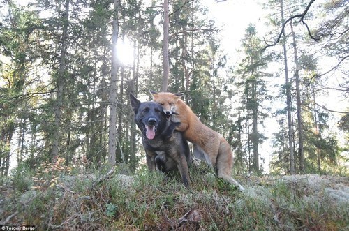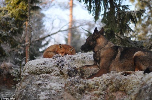 Today the Department of Unexpected Interspecies Friendship shows us a real life example of The Fox and the Hound currently taking place in a forest in Norway. Sniffer the wild fox and Tinni the domestic dog first met by chance while Tinni was out for a walk with his human, photographer Torgeir Berge. The unlikely pair became fast friends and now Torgeir photographs their heartwarming daily encounters. Sniffer and Tinni frolic in their secluded woodland playground until they’ve tired each other out, at which point they settle down and relax together.