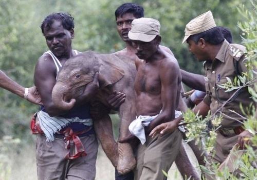 SEPARATED: Forest Department personnel carry the just-born calf...