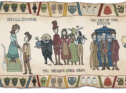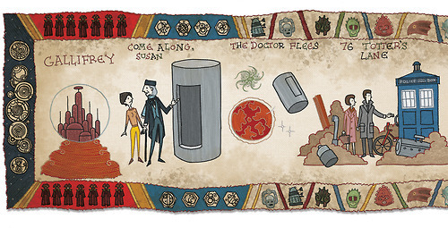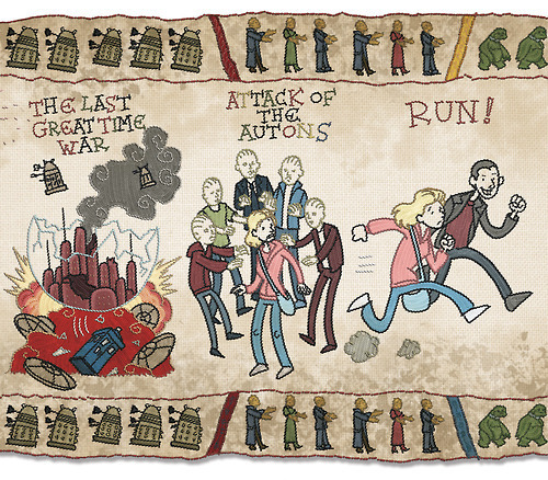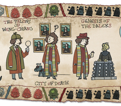 To celebrate the 50th anniversary of Doctor Who, I drew this slightly ridiculous tribute to the Bayeaux Tapestry - I had originally intended this to be one 12-foot long image, but then I realized that if I were to ever turn this into a print that it would be impossible to frame (and difficult to view in one piece online), hence the more conventional 24x36-inch print available here.