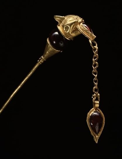The top of the gold pin is a finely modeled lynx head. A small molding on the shaft of the pin keeps the garnet bead and conical collar from slipping off. One setting with a tear-drop garnet is firmly fixed in the lynx’s mouth by a pin, the extremity of which is looped. Chained to the loop is a second tear-drop garnet.