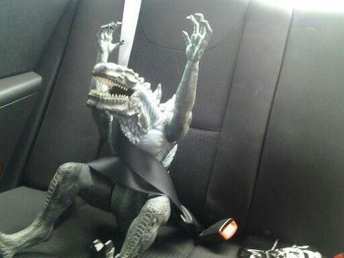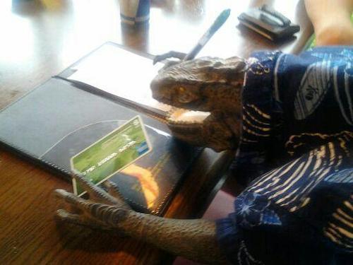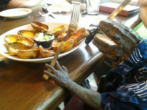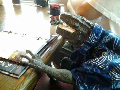 My friend was walking and found this Godzilla toy in the Trash so he put a shirt on it, named him John, and then took him out to T.G.I. Fridays and then Dinner was on John.