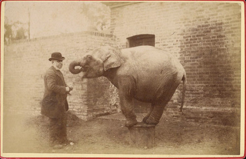 ca. 1860-90’s, [cabinet card, portrait of a stout man and small elephant, who balances precariously atop a stand and appears to be putting some treat in his mouth using his trunk], Nicholls