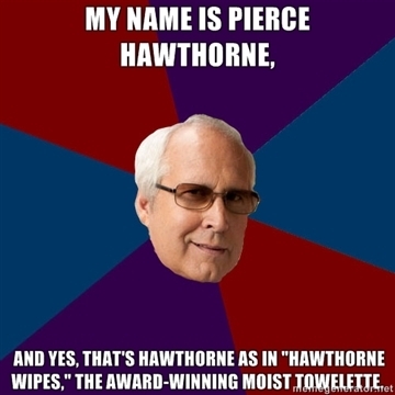 Impersonating Rodney Dangerfield, Abed wants Pierce to play out a scene. Pierce breaks character, becoming Chevy Chase and begins ranting about why no one can stick to the script. He storms off the set, leaving the rest of the cast in awkward confusion with the camera crew clearly visible. Fade to black.
