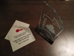 My poem “Heaven is the Hell of No Choices” was announced as the winner last month of the Aurora Awards in the Best Poem/Song category! It appeared in Issue #4 of Polar Borealis Magazine, edited by R. Graeme Cameron. Thanks to everyone who nominated and voted for this poem.