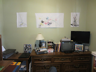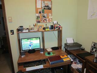 The room is small. It's 6 x 8, but it's a nice calming moss green and right across the hall from the bathroom. The window is to my back as I write. I love to look out the window, and it can get distracting if I'm facing it.