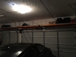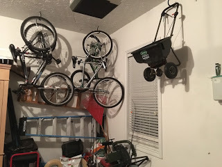 The key to having a clean garage is a timely PURGE. We try to get to it twice a year, as the seasons change between warm and cold. Every year more toys are donated or dumped as my kids get older. It only makes sense.The Fall brings lots of leaves and usually half a tree's worth ends up blowing into our garage. A BLOWER is a great tool for cleaning them out.I love organization. Most people have shelving units, tool racks, and bins for toys and shoes in their garage, but my hubs went a step above and built HIGH SHELVES over the garage doors for off-season storage. (We recently did a major purge as we are moving soon, that's why they look empty)HOOKS are also great for hoisting ladders, bikes and other stuff that's only used for part of the year, up and out of the way.