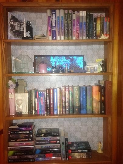 Here's my new shelf! Entirely lined with pretty paper. On the top shelf is a copy of each edition of each of my books, and on the left...