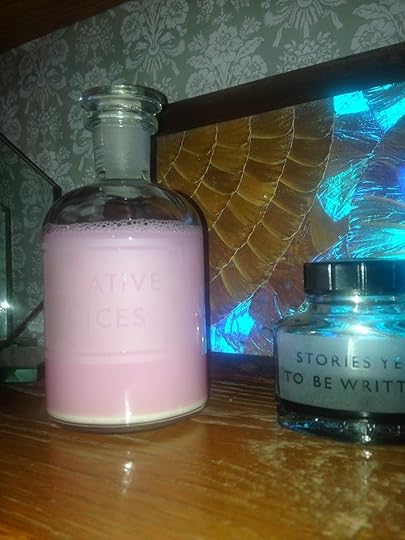 It's hard to read here because of my flash, but in the pink jar is "Creative Juices." (In reality, it's some slightly shimmery body spray, and when I need a bit of inspiration, I can actually use it as perfume!)