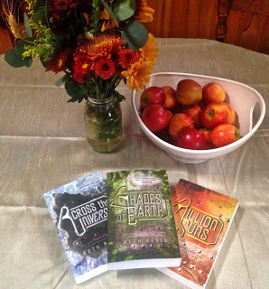 The paperback of SHADES OF EARTH comes out on November 14, and I am super excited. Because, well, this is the first time the entire trilogy has matched. Look how beautiful they all are--all the same size, with the same cover design!