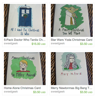 In addition to having a variety of cute clay pendants, buttons, bookmarks, and more, Lesley at SweetGeek has a line of cute Christmas cards perfect for the nerds in your life. Also? Ornaments! And wreaths!____________________________________________________