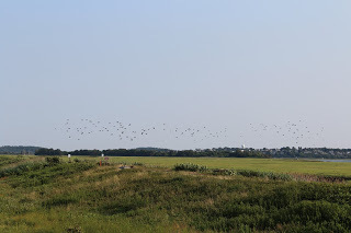 One of the things Plum Island (and therefore my fictional Pear Island) is well known for is birds. It's a wildlife rufuge, and a well known location for bird photography. Bo is pretty dismissive of people who do this, but the birdwatchers I ran across were delightful. They tried very hard to tell me about the local birds, but alas, I am not very bird-orientated, so I just got a few picks of these lovely flocks of birds that swooped like a dark cloud over the marsh water.