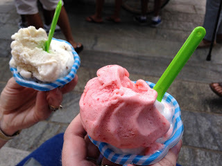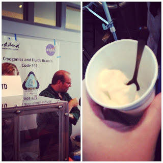 After exploring all of NASA's cool missions at the Goddard Center, Renee, Megan, Maggie, and I went over to the jamboree that was being held, showcasing more of NASA's missions. The one that particularly grabbed me was the cryogenics branch--because of Amy and Elder in Across the Universe, obviously--but also because they were offering cryogenic ice cream! :)
