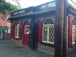 For dinner, we went to Louis' Lunch, which, according to legend, is where cheeseburgers were invented. They take the recipe to heart, serving them exactly the same way as they did in the old days: