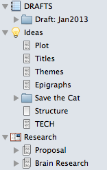 Going back to the Drafts folder: because I make it up as I go, I tend to have to rewrite. And rewrite. And rewrite. And that's where drafts come in. That current folder--Draft: Jan2013--has almost 25,000 words in it.
