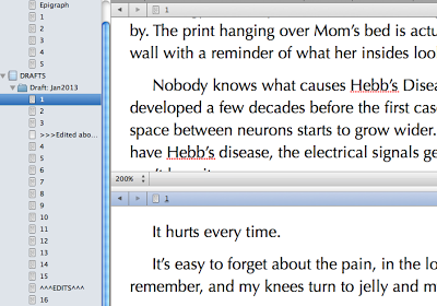 Above is an actual screenshot of the novel I'm currently working on. You can see in the top left, that I've only re-written up to chapter 5. In the deleted drafts, I'd reached chapter 16. The top part of the split screen is a section from the new Chapter 1; the bottom half is a section of the old Chapter 1. I write in the top section, cutting and pasting in a few scenes from the bottom that still work. The numbering of the chapters is often different--for this rewrite, I'm holistically deleting the current chapters 5-7, and adding in an entirely different chapter 2.
