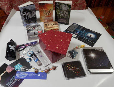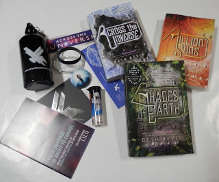 Yes! Two hidden, secret prizes. They're in the middle of the picture above, wrapped up like presents. The reason why they're hidden is because they're slightly spoilery. These two prizes are VERY relevant to Shades of Earth, and I think SUPER fun and exciting, but because they're a teeny bit of a spoiler, I've hidden them in this picture. If you want to see what they are, though, then CLICK HERE. I made a whole new webpage that shows what these super-secret prizes are.