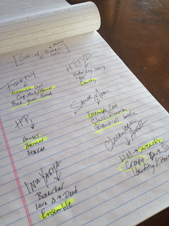 Then I went through and highlighted similarities. I noticed right off the bat that a lot of what I'd listed featured an ensemble cast and comedy in some way (usually through at least one sarcastic/funny character). I also underlined or circled some of the things that weren't similar with other things, but that I really like anyway (such as the different houses in Harry Potter).
