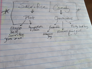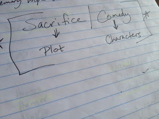 Okay, moving on. So at this point, I've come up with two puzzle pieces--I would like to have some humor, and I would like to have some sacrifice, and it's all a part of the plot and characters. I extrapolated from there: