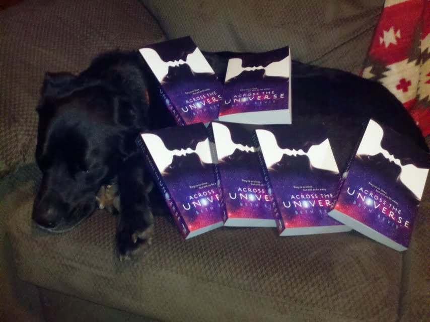 I have available to give away SIX signed copies of the UK version of ACROSS THE UNIVERSE. I also have a whole stack of brand-new-shiny bookmarks and pin buttons to give away. Let's let my dog model the goods: