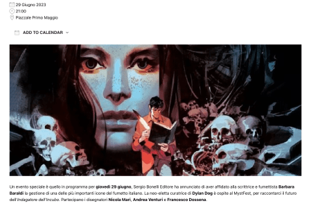 Giovedì 29 giugno alle 21 nel Piazzale Primo Maggio si terrà una serata dedicata alla Quinta stagione di Dylan Dog. «Un evento speciale è quello in programma per giovedì 29 giugno, Sergio Bonelli Editore ha annunciato di aver affidato alla scrittrice e fumettista Barbara Baraldi la gestione di una delle più importanti icone del fumetto italiano. La neo-eletta curatrice di Dylan Dog è ospite al MystFest, per raccontarci il futuro dell’Indagatore dell’Incubo. Partecipano i disegnatori Nicola Mari, Andrea Venturi e Francesco Dossena.»