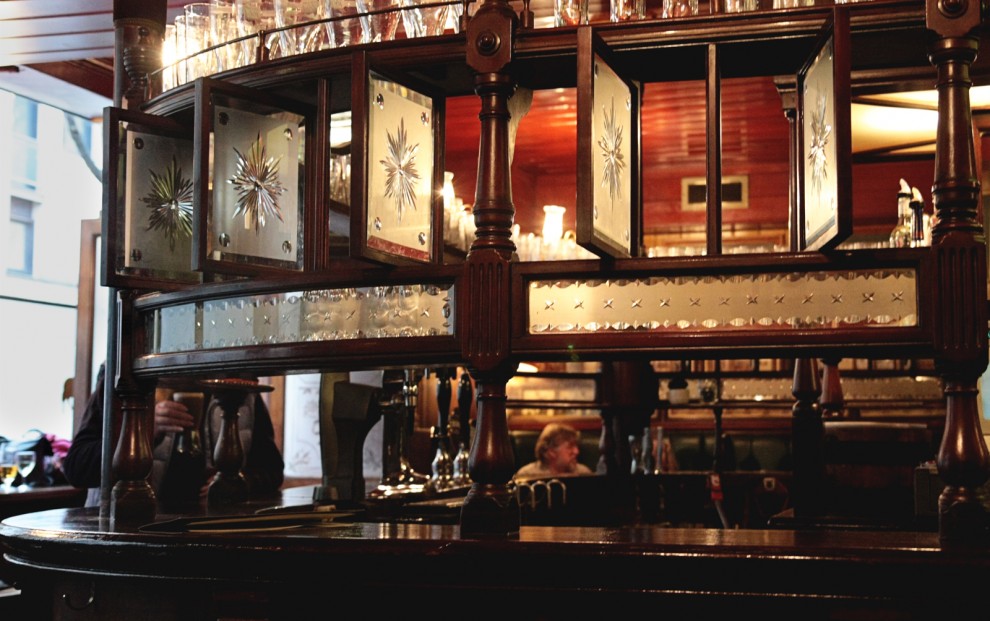 They're glass panels located at shoulder height, so customers could order more drinks from the bartender without being seen. Ah, to have lived in those times.