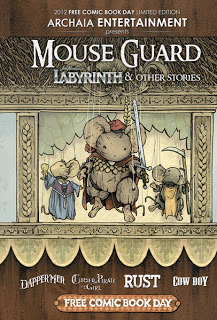 This Free Comic Book Day, Archaia offers readers the chance to experience history in the making with a FREE, gorgeous, 48-page, 6" x 9" full color hardcover original graphic novel featuring all-new material! David Petersen returns with an all-new Mouse Guard tale that's guaranteed to tug at your heartstrings! Lose yourself once again in Jim Henson's amazing world of Labyrinth, featuring a fantastical story from Eisner Award nominee Ted Naifeh (Courtney Crumrin) and Cory Godbey (Fraggle Rock). Get a new perspective on Jet Jones in Royden Lepp's critically acclaimed Rust, with a short story seen through the eyes of younger brother Oswald Taylor. Jeremy Bastian's acclaimed Cursed Pirate Girl hits the high seas in this whimsical, swashbuckling tale of wonderland journeys and unimaginable dangers. Nate Cosby (Pigs) and Chris Eliopoulos (Franklin Richards) present Cow Boy, a comedy/western that tells the tale of a young bounty hunter determined to send his entire outlaw family to jail. And Jim McCann and Janet Lee follow up their Eisner Award-winning Return of the Dapper Men with an all-new short story that leads into the upcoming sequel, Time of the Dapper Men. Witness the origin of a new, major character! And…the return of 41?!
