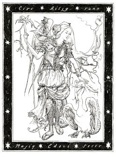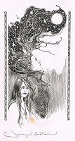 The witches were the second great race that controlled the waters and the lands they possess in the world of the Omerta Seas. This is the witch Circ Aileg, the words at the bottom -Majiq Edoui Seccr- I concocted. They might actually translate to something, but I am completely ignorant of it. For me it means "magic hides within". I've been developing a lot of back story for the world that Cursed Pirate Girl takes place in. Hopefully some day you will be able to see it. :)