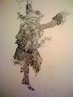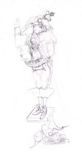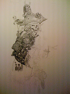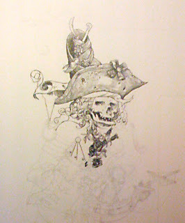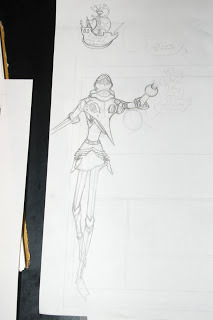 What I could not find was the original sketch of the figure that makes up the left side of the border. Which just happens to be one of the coolest things I've come up with thus far. I really like him. The figure above represents the "military might" the opposing force on the black waters of the Omertas. At least after the first story arc of Cursed Pirate Girl. The other figure represents the "Piratical will" on the Omertas. The royal soldier above is capped with a giant key, I wanted that to suggest he is more of a wind up toy than he is a free willed character.Hopefully I can get those scans soon and I will be able to show you some more.