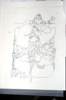 -then when I get the parts drawn up to what looks good I transfer the rough images to bristol. With this page I worked up the main image then scanned it and adjusted the size of Haftu's head and then the whole figure. I printed that out and worked up the fish on top of the print out. I take a piece of tracing paper and trace it then transfer that to bristol. I did it this way because of the minute details involved with the figures. If there is an image with less complicated details I would have just lightboxed the print out.