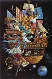 This was the first part completed. So now you can see why I particularly liked this guy. Some details you will not be able to see on these images include the nautical creatures on his cuffs and trim of his coat and the repeating fish pattern on his leather boots. Well you might be able to make out the latter a little bit. I had fun doing that, it's the first time I've ever tried doing an Escheresque pattern. And what Cursed Pirate Girl piece would be complete without a monkey. Originally I wanted the two monkeys to be mermonkeys like in the comic and have their tales coming from out of the bottom of their ships. That design just didn't make sense.I have to say what really inspired this and it's opposing figure was the book Journey of the Imagination - the artwork of James Christensen, I was not familiar with Mr. Christensen until maybe a year ago. I saw his book in Barnes and Noble and kept wanting to buy it but kept putting it off [I didn't have the $ and then when I did it was a destination too far out of the way... etc]. I'm glad I finally went out there and picked it up, it's really amazing. Very wonderful and absurd, two qualities I hold in very high regard. He also includes in many of his pieces floating fish. Which is definitely something I wish I had come up with. Anyway, you should gander at his site and search out his book, you won't regret it. Here's a couple of grabs off of the internet-