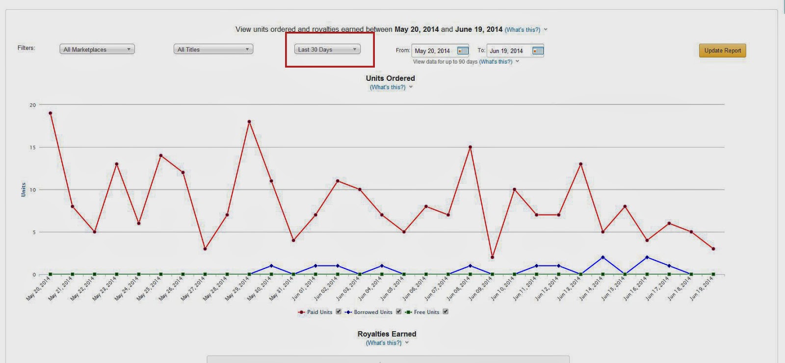 Also, you might think you lost some royalties if you are not careful. When you open the page, it defaults, as we said before, to the last 30 days. However, that means if you open it on June 30 you get June 1-30. On July 1 you get June 2-July 1. Some people forgetting that wonder why their royalties may have dropped. Well, any royalties on June 1 are no longer reflected. So unless your royalties have gone up on July 1, the number could go down. It is best for you to always set your date range to the specific range you want a report on.