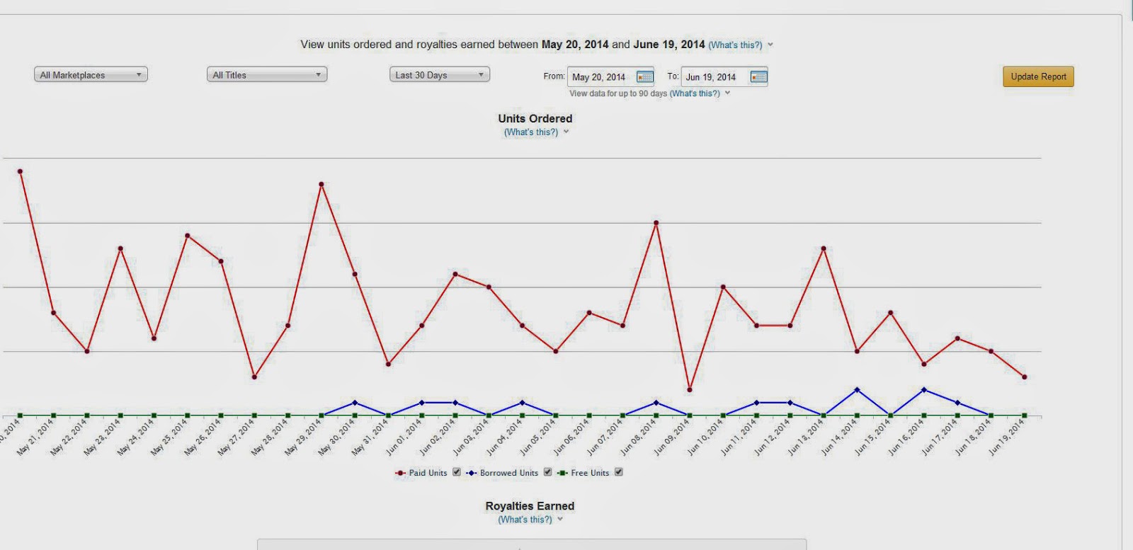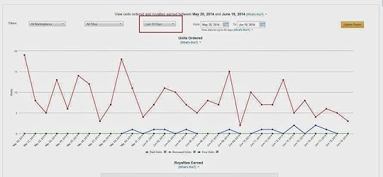 This will show your sales, borrowed books and free books. The red line represents sales. The blue line is books borrowed through the Kindle Owners Lending Library.