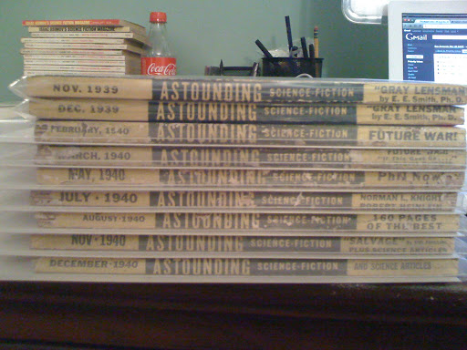 That stack contains the Nov/Dec '39 Astounding's which include E. E. "Doc" Smith's "Gray Lensman"; the Feb/Mar '40 Astounding's which include Heinlein's "If This Goes On…" and the first part of Hubbard's "Final Blackout"; and the May, July, August, November and December 1940 issues of Astounding.