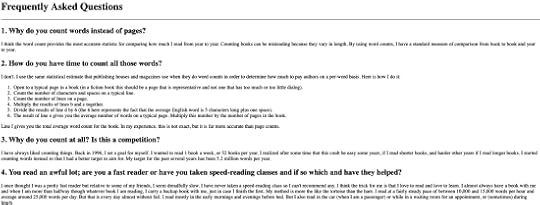 The first web pages I put on the public Internet were also of the simplest formatting. Of course, they were all about books and reading. I found a couple of examples on the Wayback Machine, including a page on my favorite science fiction writers of the time (circa 2003) and an FAQ on my reading list. (Naturally, the list of books I’ve read since 1996 was one of the first things I put on the web.)