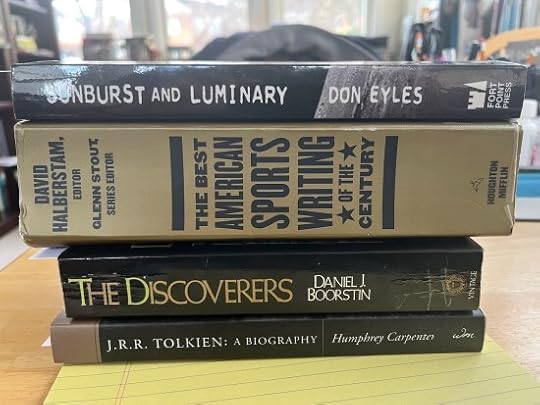 Which means that when I finish Sunburst and Luminary, I will return to The Best American Sports Writing of the Century. When I finish that, I will return to The Discoverers. Since The Discoverers is the first in a trilogy, there is a chance that The Creators will get pushed onto the stack, followed by The Seekers. When I finish those, I’ll finally get back to the biography of Tolkien. And once that is finished, the stack will be empty.