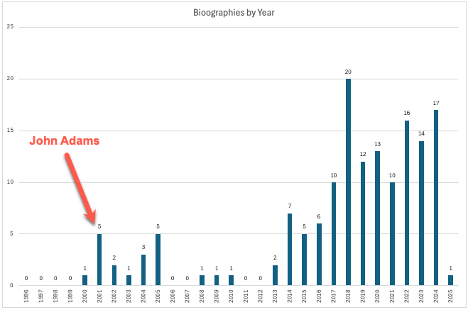 Prior to John Adams, I’d never really been interested in biographies, mainly due to lack of exposure. I went through the list of books I remember reading before I started keeping a list in 1996, and I couldn’t find any biographies on the list. That changed after reading John Adams. In 2000, I read Carl Sagan: A Life in the Cosmos by William Poundstone. This is the first biography (excluding memoirs and autobiographies) that appears on my reading list, and it took me over four years before I finally decided to read a biography. A year later, I read John Adams, and the avalanche began to build. Over the next quarter century, I read more than 150 biographies alone. The graph below illustrates the progression of this avalanche.