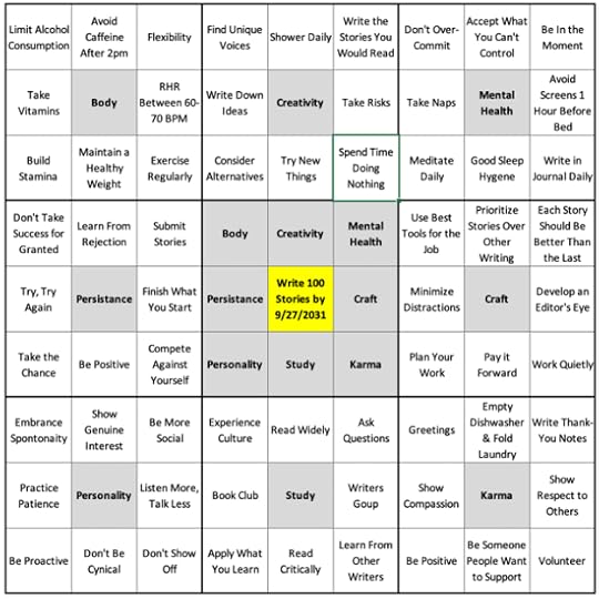 In late December 2023, while on holiday in Florida, I happened upon an article that described a goal matrix that Shohei Ohtani, the major league baseball phenom, created when he was only 17 years old. This matrix centered around 9 areas and had the goal of being drafted first in the MLB draft. I was impressed by this and thought I could use a similar matrix to jump start my writing. I set myself a goal of writing 100 stories over the next 7 years, or so–about 1 story per month. Why 100 stories? Because every story is practice and practice helps to improve the craft. I was never prolific with my fiction writing and I figured if I could write 100 stories, that would be all the practice I’d need to hone my skills to the level I knew they could reach. I used the Ohtani’s model to build up support structure for achieving that goal. Here is my matrix: