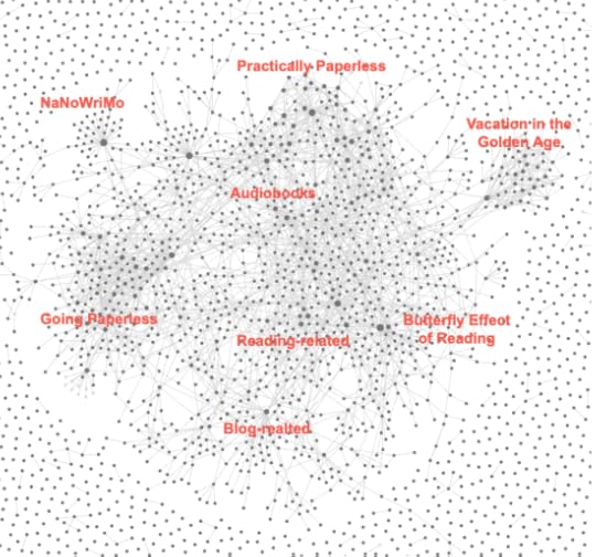 Above is the graph of just the 7,000 blog posts in my Obsidian vault, and within that graph you can see the posts that link to one other. If we zoom in, you can begin to see clusters within the linked posts, a few of which I have identified below: