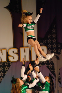 Taryn's Junior Red team(level 3) also took first place and hit a perfect routine. Woot! Because of their awesome performances, both teams won bids to the All Level World's competition in April. Yeah, baby! Very cool!