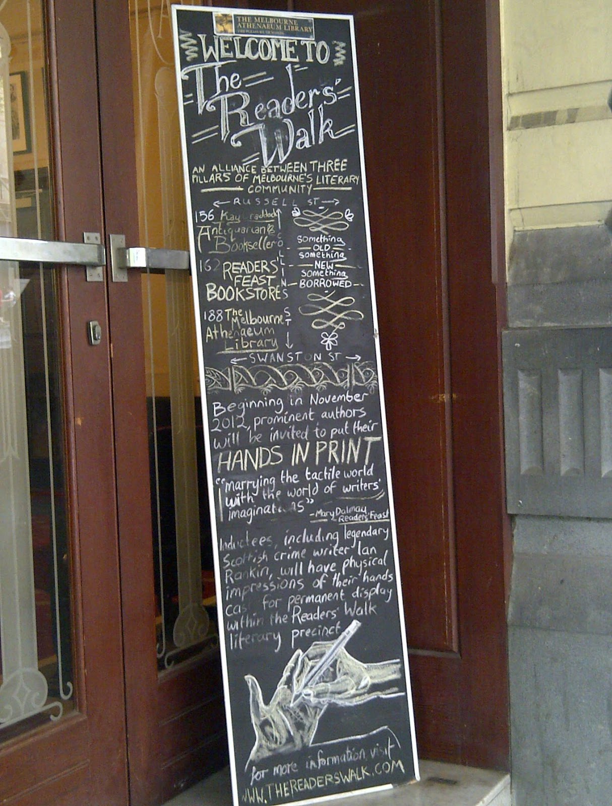 Di Collins Street, Melbourne Athenaeum Library berjiran dengan Reader's Feast Bookstore dan Kay Craddock Antiquarian and Rare Books. Semenjak akhir tahun 2012, ketiga-tiga institusi ini telah bergabung menawarkan pengalaman budaya buku dan membaca yang luar biasa di Melbourne. Ia dikenali sebagai Reader's Walk.