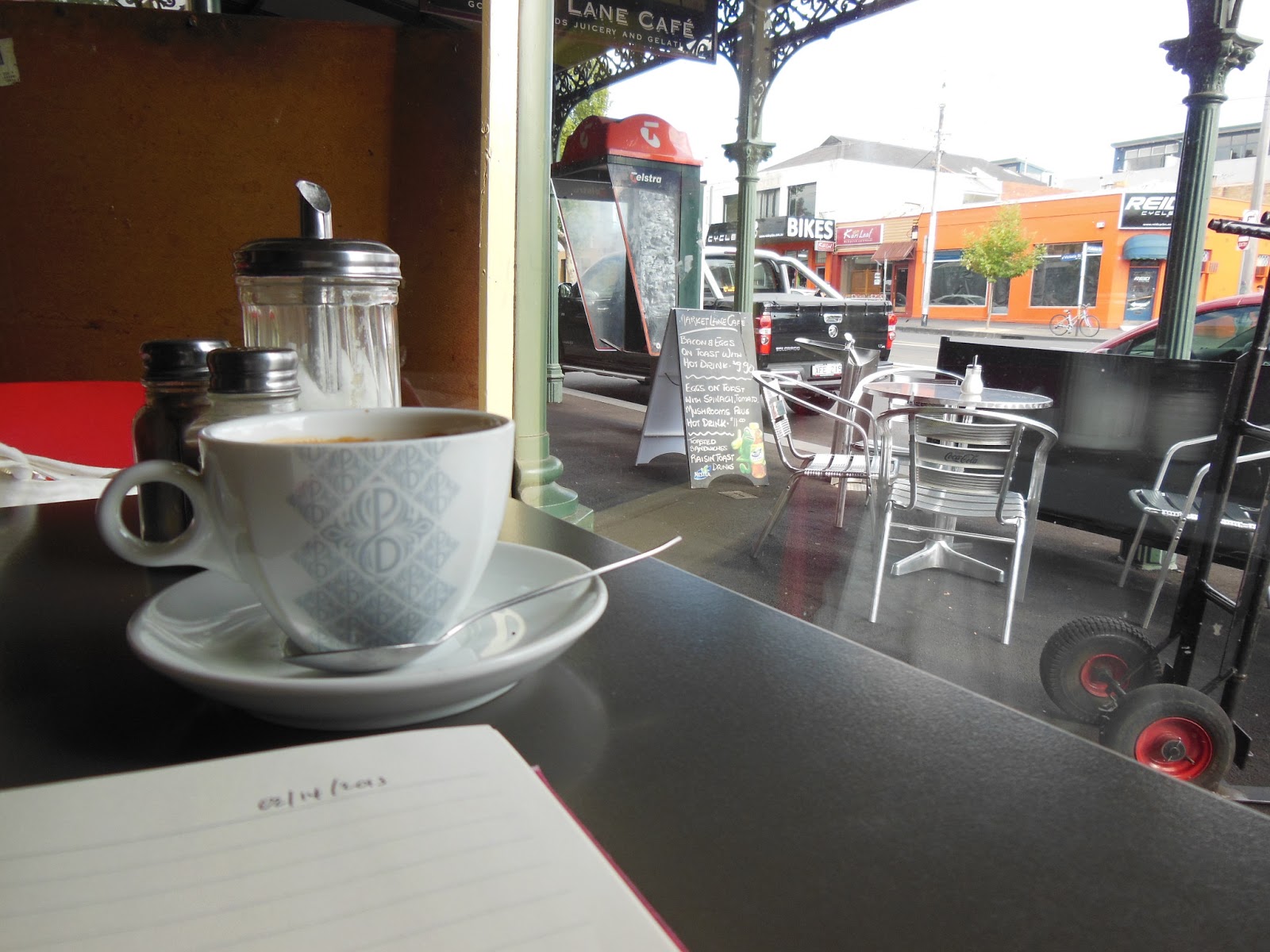 Kafe cadangannya yang pertama disinggahi adalah Market Lane yang terletak di Queen Victoria Market. Saya bersarapan like a king di situ, telur hancur dan dua keping roti bakar bersama secawan kopi hitam. Kafe ini berkonsepkan diner dan dibuka mengikut waktu pasar beroperasi, lazimnya hanya sehingga tengah hari kecuali pada hari Jumaat (5 petang). Kopi yang dibancuh di sini adalah Piazza D’Oro; ia kurang pahit dan kurang berasid berbanding Arabica kebiasaan saya di Kuala Lumpur. Namun, apabila dipadukan dengan telur hancur yang gebu (kalau buat sendiri tak pernah menjadi!) dan roti bakar yang garing, sedap juga!