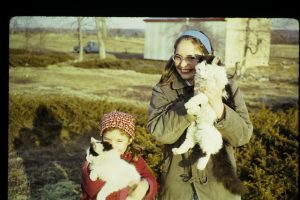 Cats with their greater numbers disappeared regularly. “Grandmother Cat,” the tabby breeder in the barn, had litters by toms who came and went in the night. Grandmother Cat would not let us touch her, though we could take her milk warm from the cow and pet her kittens. A few offspring chose domestication. This was especially true after a fluffy white house tom went rogue and a Persian blend appeared. One white kitten had a blue eye and a green one, familiar of a good witch. The self-chosen would scoot around an open screen door and dodge my mother’s discouraging foot and “shoo.” They too tended to disappear before reaching old age. Farm equipment would mow them down; distemper would flair up. Cats didn’t warrant vet care when rural folk could scarcely afford health care for themselves. There was a rabies scare—blame the raccoons. The state health department clamped down on the required dog vaccination and enlisted farm families and volunteers to catch cats and restrain them in onion bags. Vets could inoculate the yowlers right through the netting. Nothing’s as fast as a cat let out of a bag.