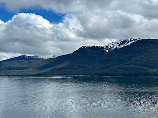 As we traveled, land and mountains were all around us. The air was crisp. Clouds touched the tips of the mountains around us and danced. We saw the tail of a whale and his blow hole as we made our way into Juneau.