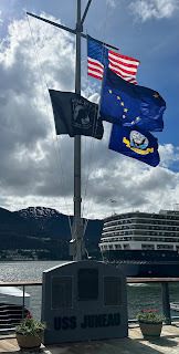 At noon, the ship docked in Juneau. Brent and Andy went on their kayaking adventure. Joey and I got off the ship and explored Juneau before going to our Salmon Bake. One of the things that I saw when I got off was a memorial to a ship – the USS Juneau. I paused and let the moment sink in. I was in Alaska.