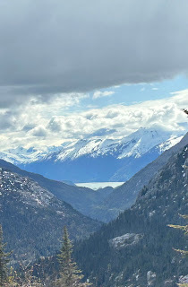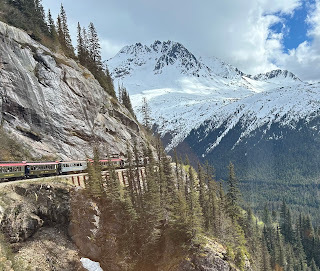 I got some sticker souvenirs, and we made our way back to the Train station. We must have waited for about 30 mins before it was time to get on the train. We were going to ride the White Pass train to the Canadian border and then come back. It was a 2.5 hour ride. We learned how the railroad was built alongside White’s pass. The train went from sea level to 3,000 feet and there were lots of twists and turns. It was a nice ride. The views were amazing and I’ll share a few here.