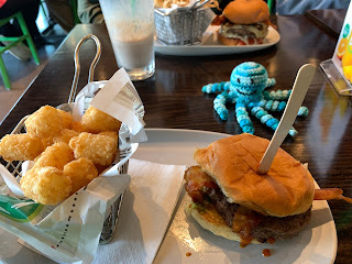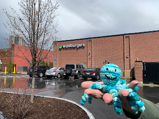 Today's critter is "Octo." Octo's maker is my sister, Christine, who usually makes octos for her kitties to play with. Here, Octo has joined on vacay in April 2022. Octo can't wait to try the Wahlburgers.