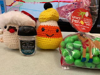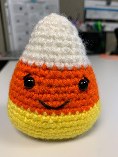 While Loricorn looks like candy corn, she got her name from another co-worker (Lori) who likes to make popcorn and share her popcorn with us. Her popcorn is usually pretty good – it’s just movie theatre butter flavor and no one can turn down a bag, so I decided to name my little after my co-worker, hence, Loricorn.