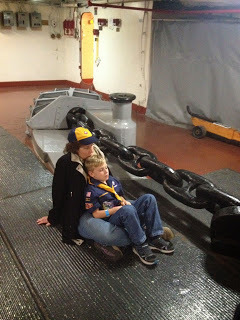 Learning about the anchorsOur staff gave us guided tours of the engine room, (Joe's favorite part of the visit was acting like steam) the emergency control center, the flight deck, the bridge and catapult control rooms.