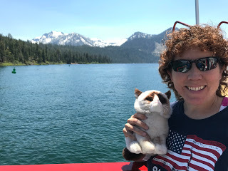 Here's me and my buddy, Grumpy Cat, as we take a cruise on Lake Tahoe. In the background are the snow covered mountains.